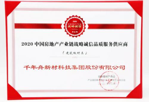 现场隆重发布《2020年度中国房地产产业链战略诚信供应商研究报告》,同时揭晓多项年度重磅大奖,其中千年舟不负众望,凭借强大的品牌实力和行业称赞的诚信口碑,荣获“2020中国房地产产业链战略诚信品质服务供应商”荣誉称号。