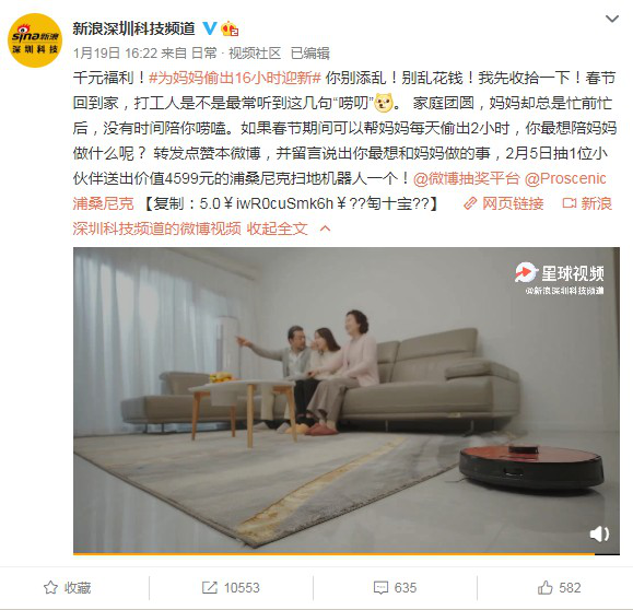 千元送福利!现在只要关注新浪深圳科技的置顶微博,参与#为妈妈偷出16小时迎新#话题,转发并点赞此微博,留言说出你最想和妈妈做的事,在2月5日系统会揪1位小伙伴送出价值4599元的浦桑尼克星钻版扫地机器人一台!机会只有一次,赶紧做个行动派,福利送到手!