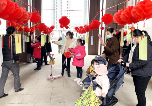 业主们参与热情高涨,在武汉实地君兰汀岸,老伯伯戴着眼镜、聚精会神地研究灯谜,小朋友们有的在一丝不苟地拼图,有的在兴致盎然地钓鱼……社区内满是欢声笑语。