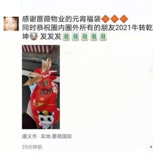 业主们也纷纷发朋友圈给实地物业点赞。遵义实地蔷薇国际的一位业主就在朋友圈晒出物业送的汤圆,说道:“有心了,物业在门口派发汤圆,辛苦了,各位亲元宵节快乐。”
