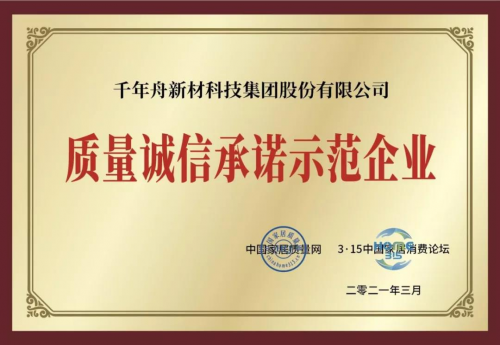 在中国质量报刊社主办的2021年「3·15中国家居消费论坛暨质量诚信承诺宣言」主题活动中,千年舟荣获“全国产品和服务质量诚信示范企业”称号,体现了广大消费者朋友们对千年舟的信赖和认可!