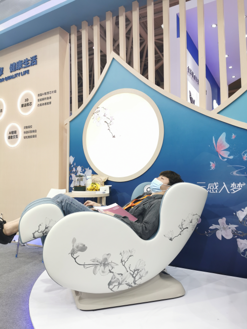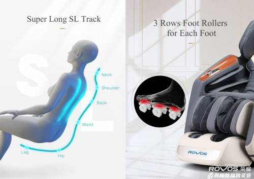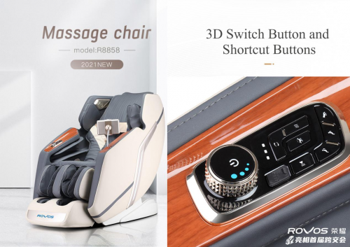 2021年ROVOS外贸新品R8858W,它带着空气维生素——负氧离子首次在跨交会上亮相,以全新的外观设计,亮眼的科技创新等智能健康按摩功能备受关注。优雅的LED外设灯光,超大LED 平板操控、超炫3D扶手旋钮设计,让你亲身体验如在豪车般舒适静谧的高级感。