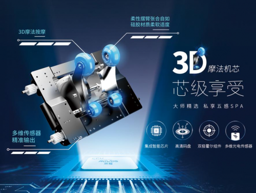 3D摩法机芯,搭载微电脑智慧芯片组,敏锐极速识别人体形体曲线、穴位和肌肉群,输出按摩数据,精准智能解析身体疲劳部位,柔性摆臂张合自如,多维传感器精准输出。