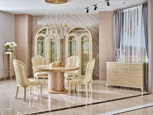 同时,金属、皮革及木质的结合让家具显得不这么笨重,有了轻盈且时尚的既视感。以玛克系列的餐桌设计为例,整体呈现出精致优雅的轻奢美式氛围,让用餐时刻变得明媚精彩起来。金属的光泽感与设计交融,凭借着其闪亮华丽的特质,焕发出迷人的魅力,形成跨时代的现代美式风生活理念。