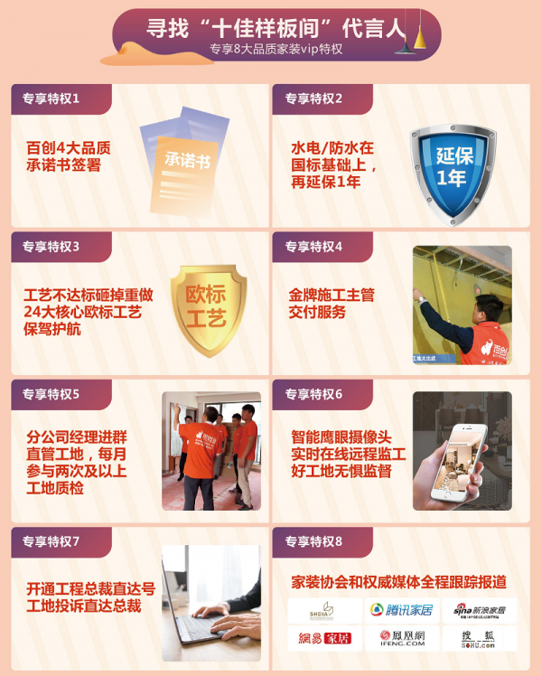 本次“品质家装节”活动,百创装饰集团推出了“全城寻找十佳样板间代言人”活动,所有3月签约样板工地将享受以下8大vip特权服务:①百创总裁签署4大品质升级承诺书;②水电工程/防水工程国标基础上再延保1年;③工艺不达标砸掉重做,24大核心欧标工艺保驾护航;④金牌施工主管现场施工管理;⑤分公司经理直接管理工地;⑥工地全程实时直播,远程监督;⑦开通工程总裁直达号,工地投诉直达总裁;⑧深圳市家装家居行业协会全程指导,腾讯家居、网易家居、新浪家居、搜狐焦点、凤凰网等权威媒体全程跟踪报道。