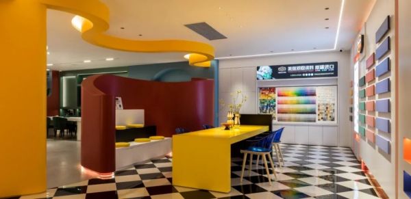 改造前的店铺为传统的涂料销售门店,店铺空间凌乱,对于往来家具城的人而言,并没有很强的吸引力。设计师张天将门店全面升级,旨在打造一个多元体验的色彩博物馆,顾客不但可以了解品牌和涂料的相关知识,亦能沉浸体验色彩的无限魅力。