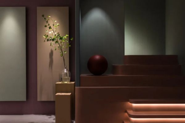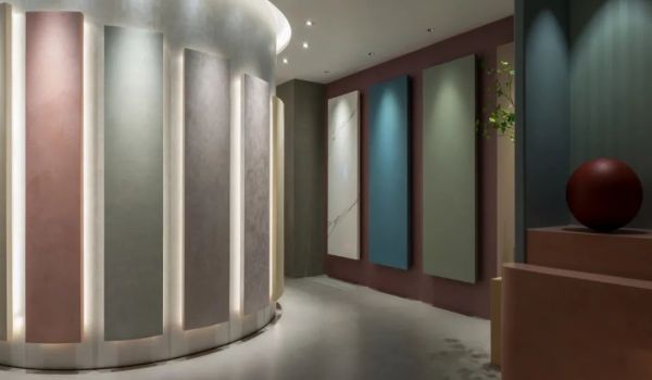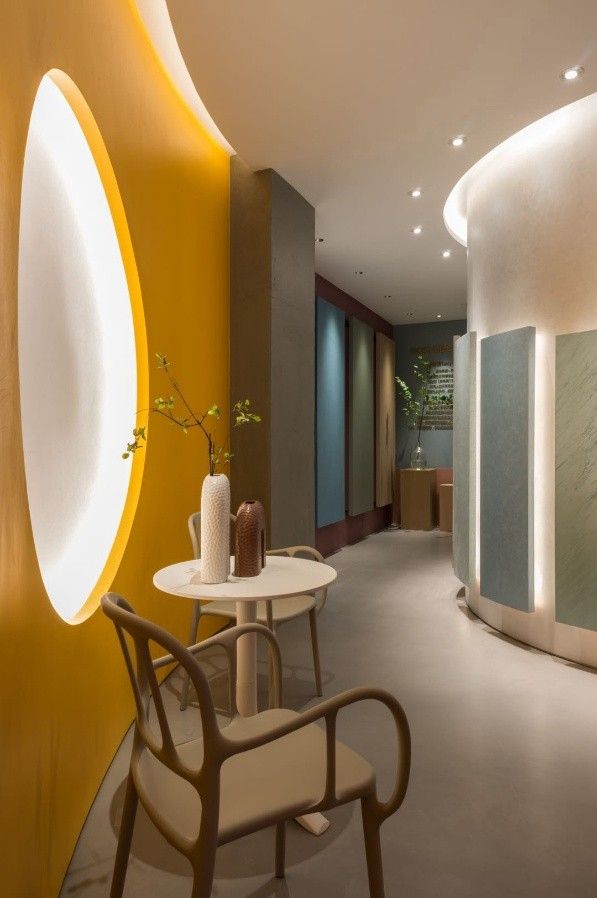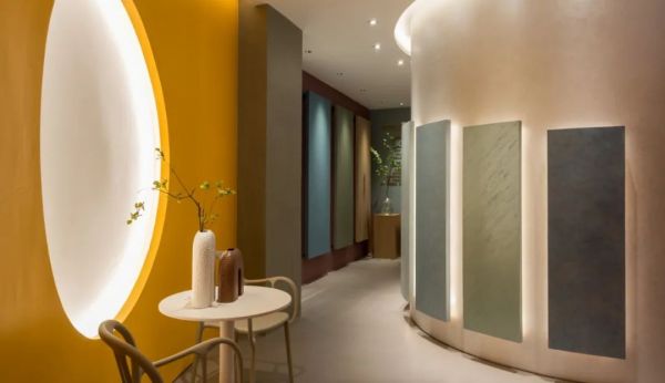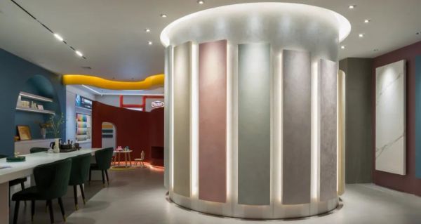 处于展厅中心位置的圆形独立空间,专门设置了沉浸式产品试验区,通过多重手段对比、分析,给客户全新的购物体验。沉浸体验区的外墙面为材料展示提供了绝佳空间,结合商业空间设计可持续的大命题,张天将艺术涂料展示在一块块浮起的石膏版上,极大的方便了后期更换展示商品。涂料展示板排列高低有序,灯光恰到好处地勾勒出纹理,传统的展示墙面被赋予了灵动之美。
