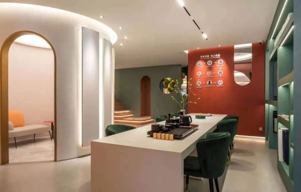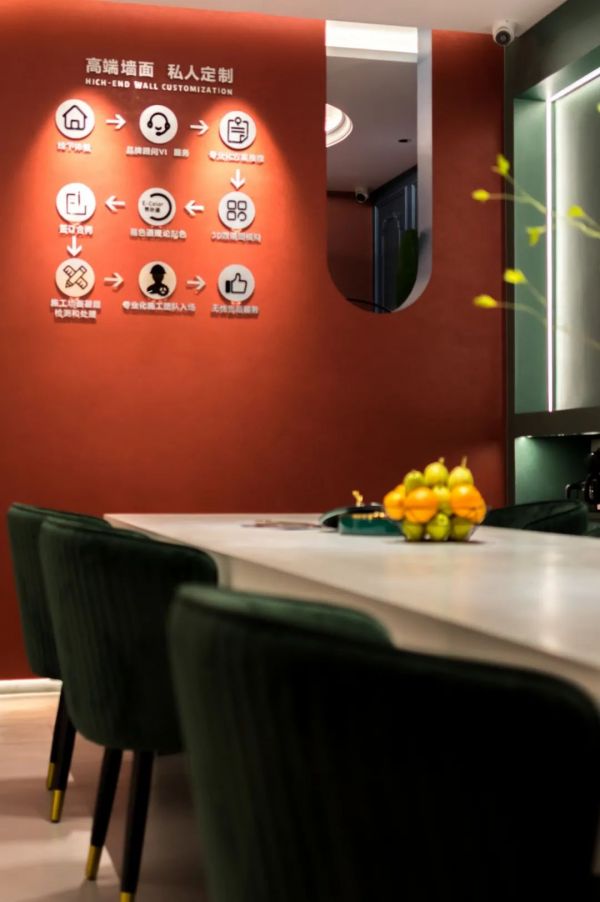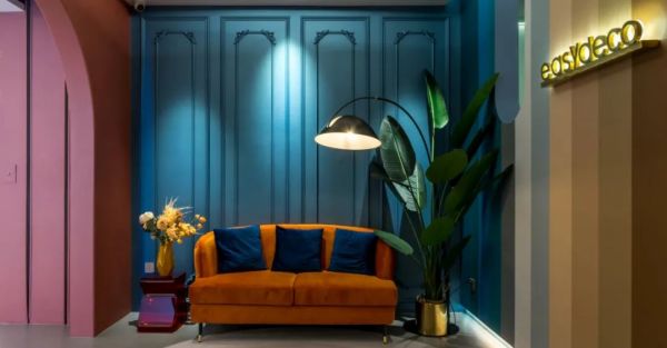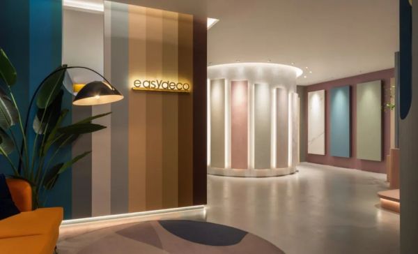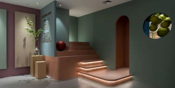 Easydeco易涂得艺术涂料入口处风格迥异,设计师运用拱形结构,在入口营造宁静的氛围,一组室内休闲场景的打造,顿生对理想家的向往,步入店内,5米长的过道增添了进入的仪式感,同时确保了展厅洽谈区的私密性。