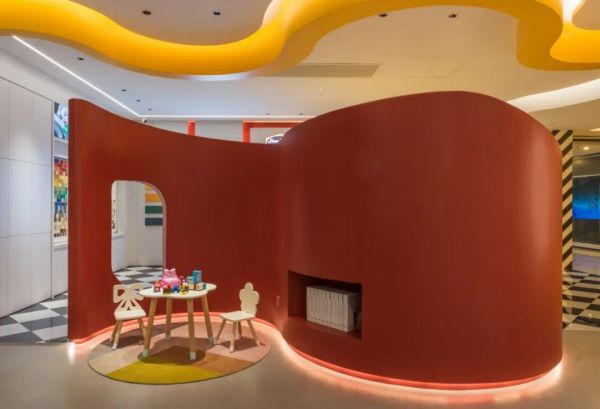 张天最终选定了利用“S”形的完美弧线,过渡两个相对独立空间,衔接起舒缓与热烈的“乐章”。“S” 形隔墙自然形成了两个半封闭空间,一边作为儿童游乐区,吸引淘气宝宝,让购物不再分心;一边设置为沙龙活动区,用于承接各种小型活动。