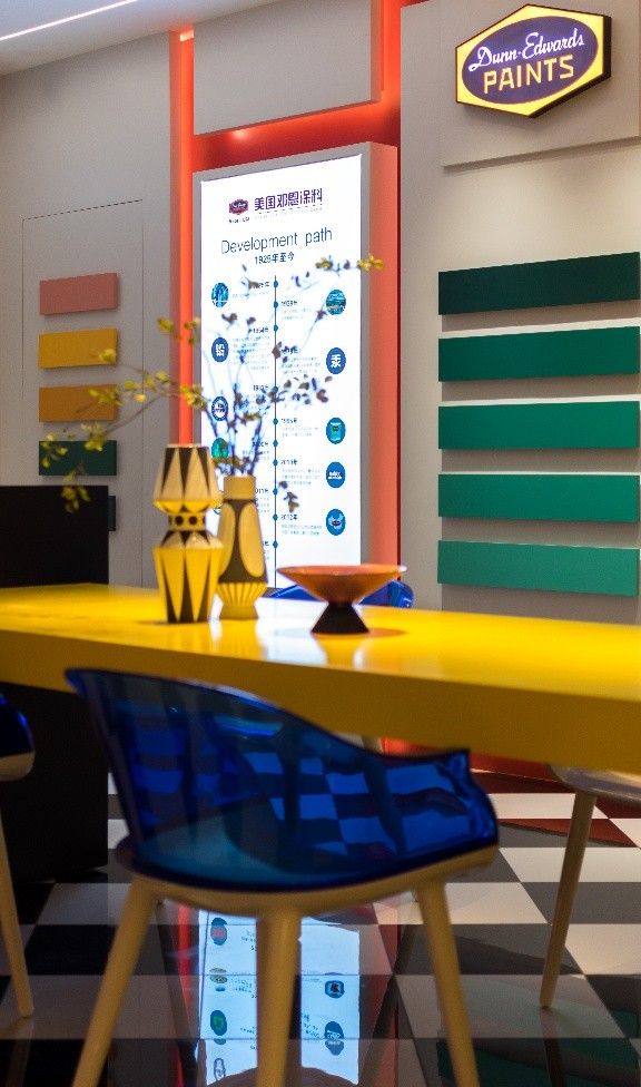 展厅空间打破局限,向外生长、延续,在展厅对外的2个入口处,持续释放出“诱人”的讯号。美国邓恩涂料入口开放,大面积的黄色涂料墙在大的场域中形成视觉焦点,弧形墙面的向内弯折角度极具引导性,使人不由向内窥探;黑白菱格铺设的地面在浓烈色彩的映衬下,迸发出强烈反差,给了游客一个“一探究竟”的理由。