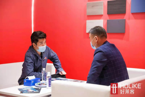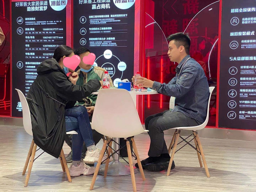 好莱客艺术整装洽谈区吸引了众多意向加盟商火热咨询,现场招商人员耐心讲解了艺术整装模式核心优势。