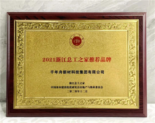 千年舟在本次年会中以过硬的产品质量和品牌美誉度,被授予“2021浙江总工之家推荐品牌”!