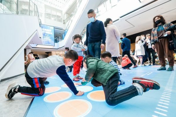 孩子们在体验Seedplaza种子广场内的互动地屏