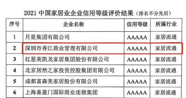 3月全国工商联家具装饰业商会发布《2021中国家居业企业信用等级评价结果》,香江家居获评“2021家居企业信用评价AAAAA级企业”。