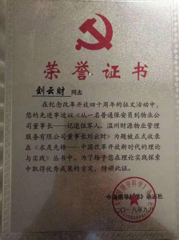 浙江温州财源物业管理服务有限公司董事长刘云财中年创业 从“心”出发“只要有梦,什么时候出发都不晚。”这是刘云财的一句至理名言。的确,在年过半百的年纪,开启人生的创业之路,这份勇气让人佩服。对此,刘云财也感慨到,自己的父亲就是一名老红军,从小耳濡目染,自己也有一种不服输、敢于拼搏的精神.