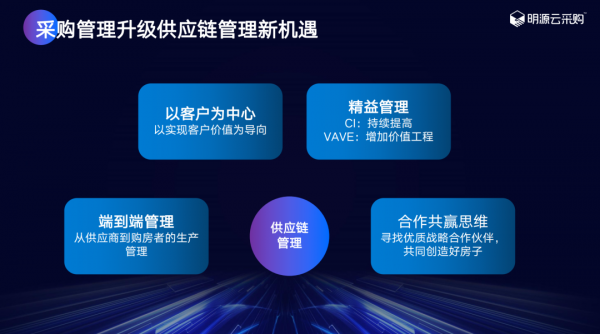 从采购管理的角度来看,其实是以进度、质量、成本为中心的赋能工程,到以购房者为中心的赋能营销的升级,助力开放商更快的打造好房子,为购房者提供高价值产品,让营销变得更简单。