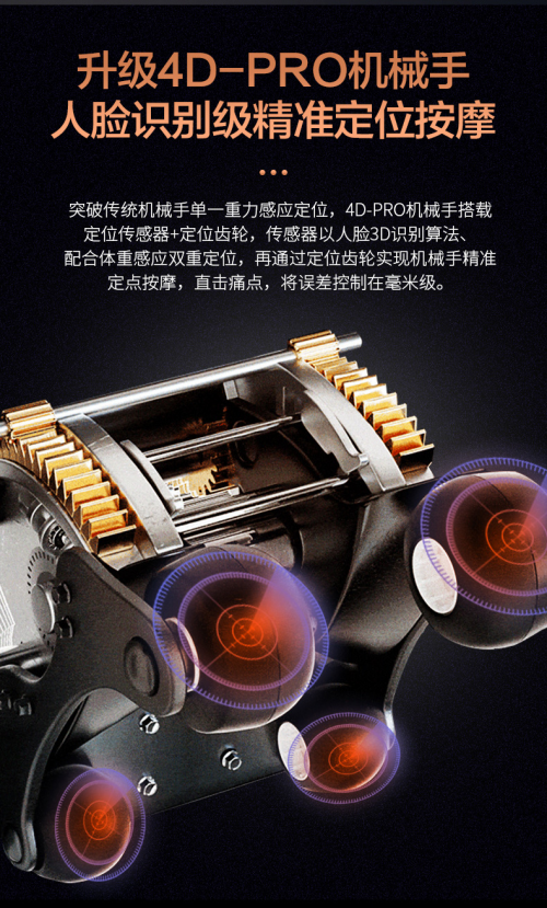 欧利华A8909装的有定位齿轮,毫米级的,所以机械手移动的时候卡位特别准。而且有专门的定位传感器配合体重感应双重定位,还可以通过人脸识别锁定每一个用户的个人信息,像专业按摩师一样不光认识客户,还记得住每个客户的喜好,穴位找得准,力度卡得准,按起来自然舒服。