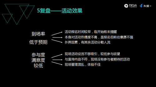 但是,如果发现活动到场率低于预期,就要思考个中原因。如会不会因为活动报名时间比较早,或者是活动开始前没提醒大家,或者是活动只进行了报名触达,后面再无信息触达用户,导致他们可能忘了这场活动,是不是他们可能一开始报名了,但最后有事也没有到场。或者是用户对活动的热情度高,虽然他们当时可能因为某些原因报了名,但最后又在更重要的事情间做了取舍,因此舍掉了这次活动。