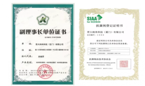 ▲ 晋大科技是全国卫生产业管理协会抗菌产业分会(CIAA)副理事长单位及日本抗菌协会(SIAA)会员单位