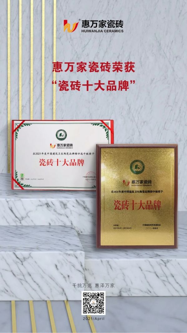 惠万家瓷砖凭借18年匠心智造和专业服务,在各大品牌中脱颖而出,荣获 “瓷砖十大品牌”荣誉称号,充分体现了行业及消费者对惠万家陶瓷品牌实力的肯定。