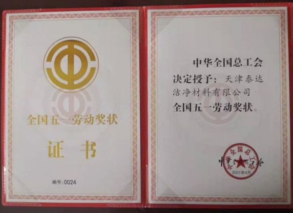 4月27日上午,2021年庆祝“五一”国际劳动节暨全国五一劳动奖和全国工人先锋号表彰大会于北京举行。会上,天津泰达股份有限公司全资子公司泰达洁净作为天津市唯一一家五一劳动奖状获奖单位代表赴会。