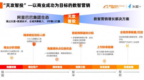 经过长期的市场调研和行业分析,友盟+打造出了一套让百货行业品效最大化的营销解决方案“天攻智投”,这是阿里巴巴的强大技术能力与友盟+丰富客群标签强强联合产出的户外智能营销平台,最早应用于阿里巴巴内部的零售体系。天攻智投具备的六大营销能力: