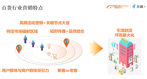 用户群体和商户群体之间的双引力,具体来看,用户之所以会选择某个商场是因为它拥有某个品牌,所以商场里有哪些品牌入驻、周边用户群体、群体画像、老客纳新都是百货营销需要考虑的要素,只有全盘调研,结合每个特性定制贴合的营销方案,才能让百货行业品效最大化。