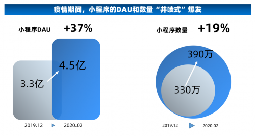 从小程序在疫情期间的整体数据来看,小程序的活跃设备、活跃用户数以及小程序的开发者数量都在短时间内实现了爆发性增长。从2019年12月到2020年2月份,小程序日活增长了37%,小程序数量也比2019年底数据增长了19%。