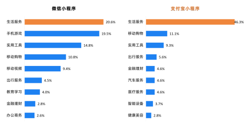 同时,从整体大盘数据来看,小程序从出现到现在的五年时间,不仅是生活服务,它整个触达的行业范围非常广,行业分布有300多个,远比App触达的行业多。目前小程序最大的两个平台,主要是微信和支付宝。