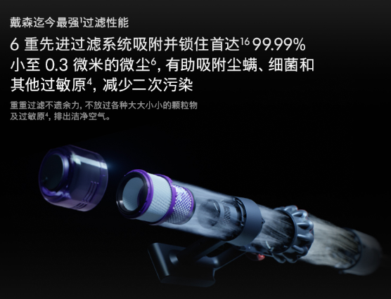 除了清洁能力很强之外,戴森V11还有着很强的过滤系统,6重先进的过滤系统可以吸附并锁住首达99.99%的微尘,可以有效地放置二次污染。避免二次污染是非常重要的事情,如果整个机器过滤系统不能高效密封到位,那么细小的灰尘就会飘到空气之中,甚至直接飞到人的脸上。特别是当过滤网已经过载了之后,灰尘就会从机器的各个角落飞出来,而使用了戴森V11之后就完全没有了这个困扰。