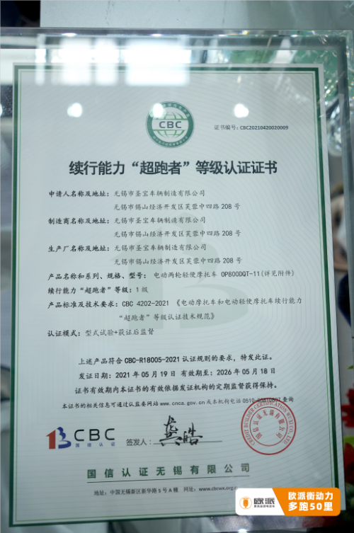始终致力于为人们打造美好出行体验的欧派电动车一直是行业大奖的“常客”,在无锡展现场,欧派电动车再一次得到了行业的充分认可,荣获了由CBC认证的续行能力“超跑者”等级认证证书。欧派电动车能够获此殊荣也不足为奇,毕竟欧派科技的科研团队有着相当丰富的前沿技术储备,这也正是欧派电动车掌握国家专利省电技术、拥有多项发明专利的主要原因。现在,欧派电动车以续行能力“超跑者”的身份,为广大用户带来更高品质的出行体验。