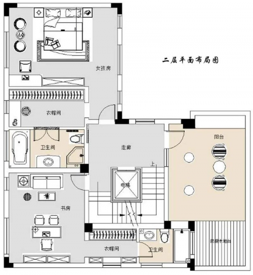 二层主要为公主房、书房、阳台、衣帽间、卫生间。