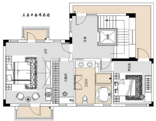 三层为主卧、衣帽间、儿子房间、卫生间