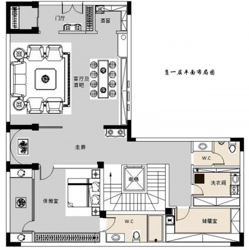 负一层为保姆室、客厅酒吧、酒窖、储藏室、洗衣房