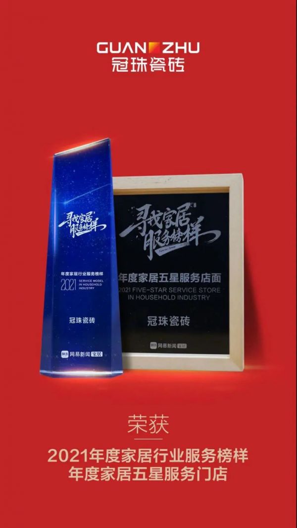 好的服务模式+真诚的服务态度,冠珠服务力备受认可,早在315服务月期间品牌就荣登“2021网易家居315服务调查瓷砖类TOP榜”,荣获“2021年度家居行业服务榜样”和“年度家居五星服务门店”荣誉。