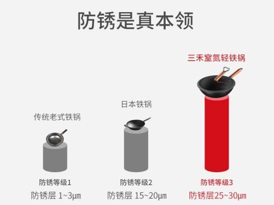 为了解决铁锅生锈的问题,于是锅具商家一直致力于防锈技术的发展:从古法捶打铁锅的氧化发蓝处理技术,到普通铁锅的液体氮化技术,再到日本铁锅的气体氮化技术(又名窒化技术),人们对铁锅防锈的研究一直在进步。而中国三禾窒氮轻铁锅首次采用的“窒氮”技术,是窒化技术的升级版本,防锈效果更是3倍于窒化技术。