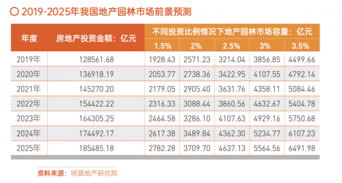 下游房地产行业的需求变动直接影响地产园林景观的市场 发展。未来,房地产市场的持续增长将继续带动地产园林景观 业务的市场扩张。2015年以来我国房地产开发投资规模增速回 落明显,预计2019-2025年间我国房地产开发投资增速维持在 6.4%左右,根据园林绿化行业经验,地产项目配套景观园林投 资占到地产总投资额度的1%-4%。根据测算,2020年我国地产 领域的园林景观市场规模在2000~4500亿元之间。