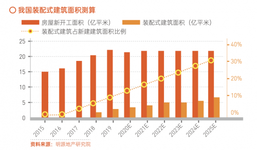近年来,装配式建筑成为国家大力鼓励和推动建筑发展的 方向,根据政策要求,2020年全国装配式建筑占新建建筑的 比例将达到15%以上,2025年达30%,发展前景广阔。建筑外墙装饰,是装配式建筑发展中不可或缺的一环,在建筑的形 态、美观、环保等方面起重要作用。目前市场上,结构、保 温、装饰一体化的外墙技术,因其环保、节能、密闭性优、性 价比高、结构质轻等特点,在建筑外墙市场中获得青睐。未 来,随着社会对环境保护越发关注,节能建筑将成为外墙装饰行业竞争的主要市场焦点。
