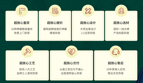 此次升级的超放心交付服务可以使屋主从施工到交付都不需要操心,全程装修价格都会透明,让屋主省心省力省钱。最后还会有超放心售后10年质保入合同,即便装修完,也会有专人追踪为屋主解决烦恼。