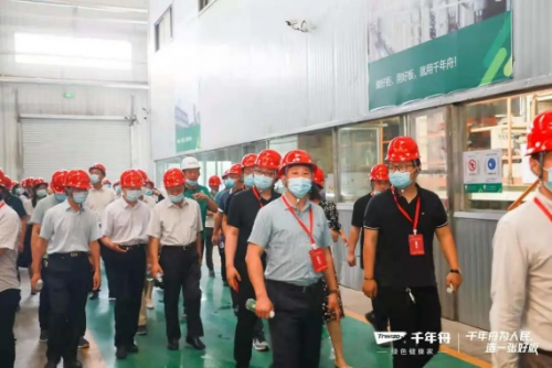 佩戴完口罩和安全帽等相关防护措施后,现场人员一同步入工厂参观。在千年舟集团副总裁田茂华的带领下,大家近距离参观了千年舟澳思柏恩日照工厂刨花板生产线、配套设施及仓库等,将工厂的现代化、智能化和环保化展露无遗。