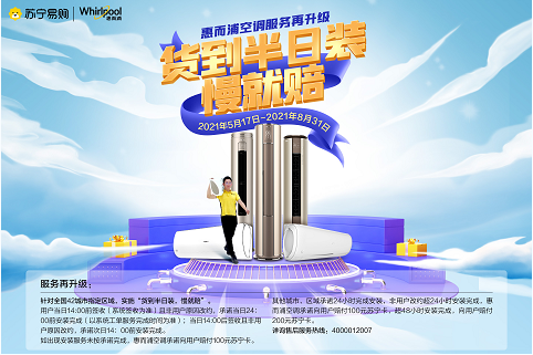 更重要的是,即日起至8月31日,惠而浦空调升级了安装服务,货到半日装、慢就赔,全国42个指定城市区域支持货到半日装,其他城市区域支持货到24小时内安装,超时即赔付,让健康凉风来得更快一些。