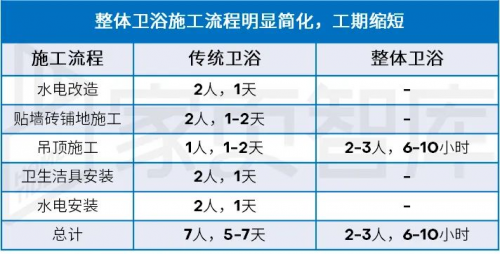 当前整体卫浴施工最快仅需2人4小时即可完成,而传统卫浴所需十余个工种,装修工期至少十六天,时间成本优势明显。
