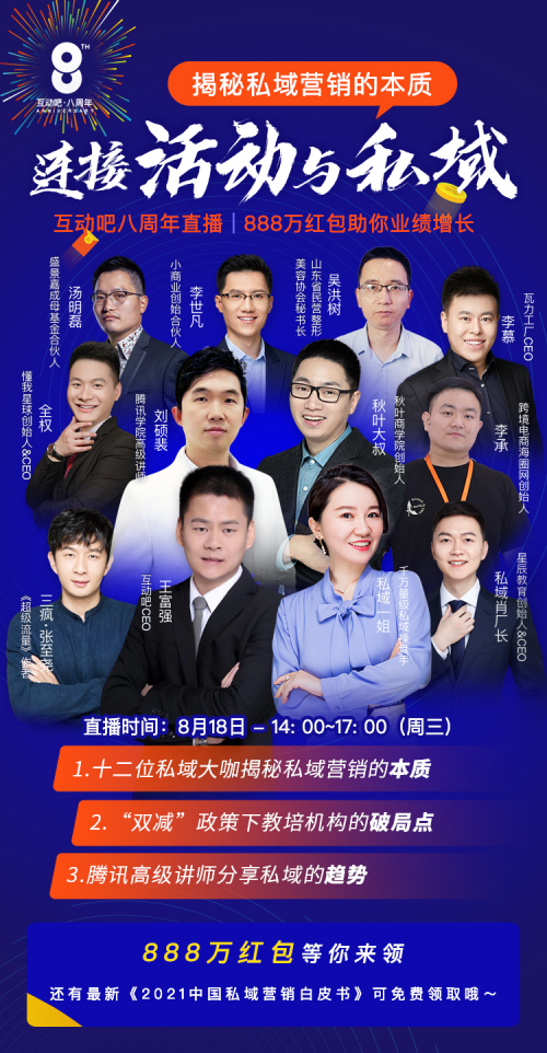 国内最大的活动发布平台之一“互动吧”,将于2021年8月18日迎来成立8周年纪念日,届时互动吧CEO王富强先生,将直播连线私域一姐、秋叶大叔、腾讯学院高级讲师、私域肖厂长、《超级流量》作者三疯等众多大咖,共同带来私域营销本质、如何抓住私域流量红利、探讨“双减”政策下教培机构的破局点等精彩内容。据悉,本次互动吧8周年直播峰会将于8月18日14:00在视频号、抖音、快手等同步播出。