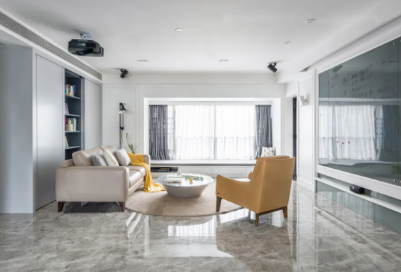 客厅的布置注重实用性,选用了白板墙来作为电视背景墙,在提高了客厅开阔性的同时,也给孩子提供涂写画画的空间。地面采用了简一的水云石系列瓷砖进行密缝铺贴,其浅灰的底色上,淡色纹理细腻而富有质感,低调而不张扬,营造出优雅、精致的空间感,再配上造型圆润的茶几,看起来自然韵味十足,而这个简约的茶几,挪开桌面,就是一个暗藏的储物空间,可以说是美观与实用兼具,设计独具匠心。