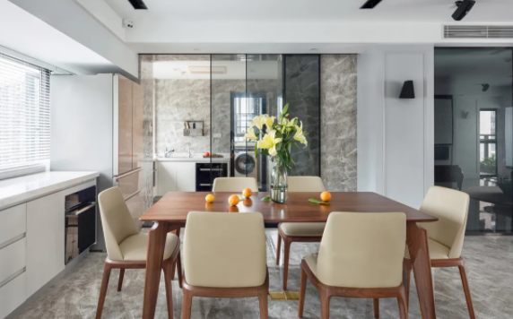 客餐厅是一体化设计,餐厨厅墙面和地面同样是沿用了简一的水云石系列,与客厅保持统一色调,形成了和谐的空间整体美。客餐厅一体化的开放式设计让视觉感受更加开阔畅通,色调明亮的定制餐边柜很是注重实用性能,其较大的储物空间,让餐厨空间收纳有序,将极简发挥到极致。餐厅与厨房以玻璃推拉门为隔,隔而不断,再加上厨房同样使用了水云石上墙铺贴,使得餐厨空间视觉上达到开放连贯的效果。