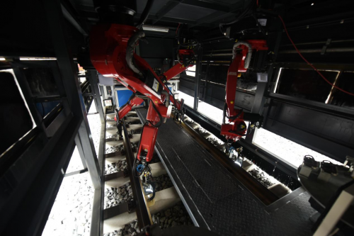 这个“大篷车”就是新运公司首创的新设备扣件智能安装车,它采用先进的智能化控制技术,通过激光和视觉定位,采用四个六轴机械手实现自动寻找、定位、安装和紧固扣配件的功能,在提高铺轨的机械化程度和效率的同时,减少作业人员25名。