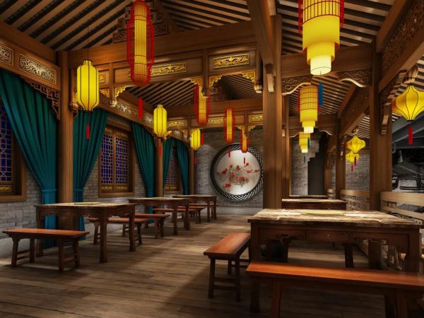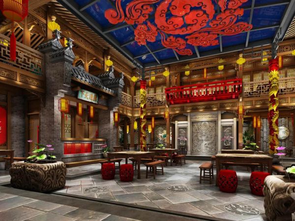 吊顶做了一个红色祥云的图案,寓意火锅店红红火火。四个角落各放上一个植物景观,四周雕梁砖瓦的精心设计,一下子把人带入到古代京城酒楼的氛围中。