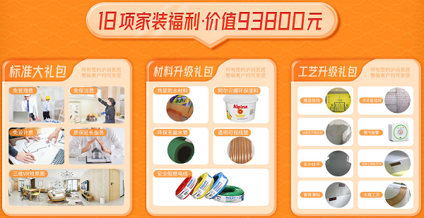 1、标准大礼包:始终以消费者的利益为核心,是沪尚茗居成功“出道”的关键。此次活动期间,沪尚茗居为签约整装的业主带来了3免(免管理费、免设计费、免服务费)、质保延长服务以及免费三维VR效果图的优惠大礼包,把家的服务做到极致!
