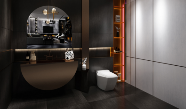 卫生间以深灰、白色为主,搭配金属色、红色加以点缀。