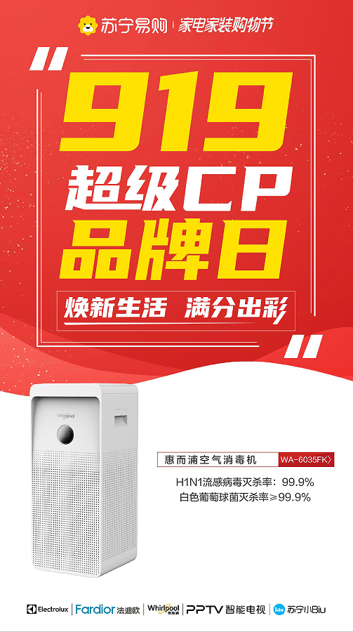 超值钜惠庆双节,品质家电护健康。由惠而浦、法迪欧、伊莱克斯、PPTV智能电视、苏宁小Biu联合举办的919超级CP品牌日,将从中秋节延续到国庆节,有需求的用户届时可前往苏宁易购全国门店咨询选购,解锁更多焕新惊喜。
